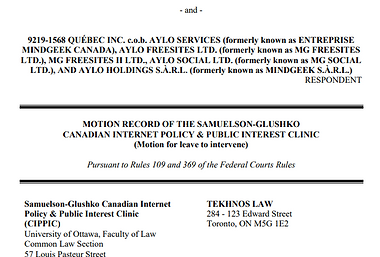 Le CIPPIC a été autorisé à intervenir dans l'affaire Commissaire à la protection de la vie privée du Canada c. Aylo